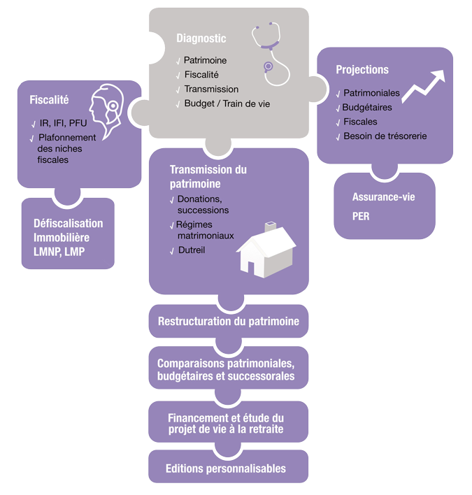diagnostics patrimoniaux, des montages, des projections, de nombreuses simulations d’investissement